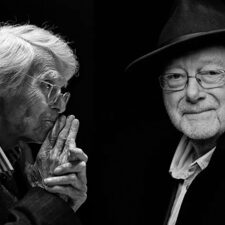A black-and-white photograph featuring two renowned figures, Frans Brüggen and Louis Andriessen. On the left, Brüggen, with his silver hair, leans forward thoughtfully, hands clasped near his face, exuding a sense of contemplation and focus. On the right, Andriessen wears a stylish hat and glasses, offering a gentle, confident smile. The contrast in their expressions—one introspective, the other quietly expressive—captures the depth of their artistry and lifelong dedication to music.