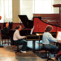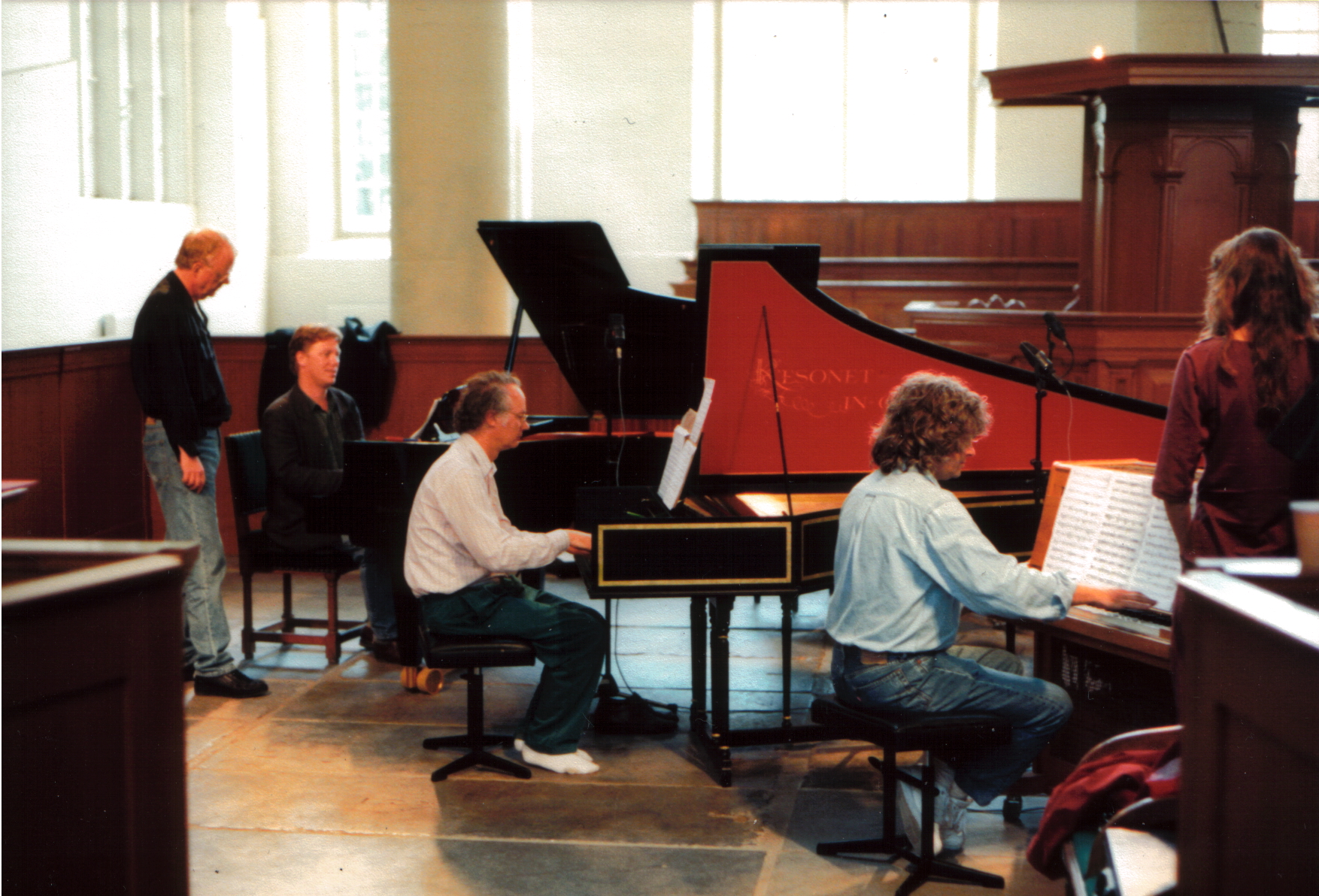 Louis Andriessen, Gerard Bouwhuis, Stanley Hoogland, Ronald Brautigam, and Annette den Heijer at the recording of <i>Double Track</i> in 1993. Photo: Frits van der Waa