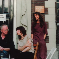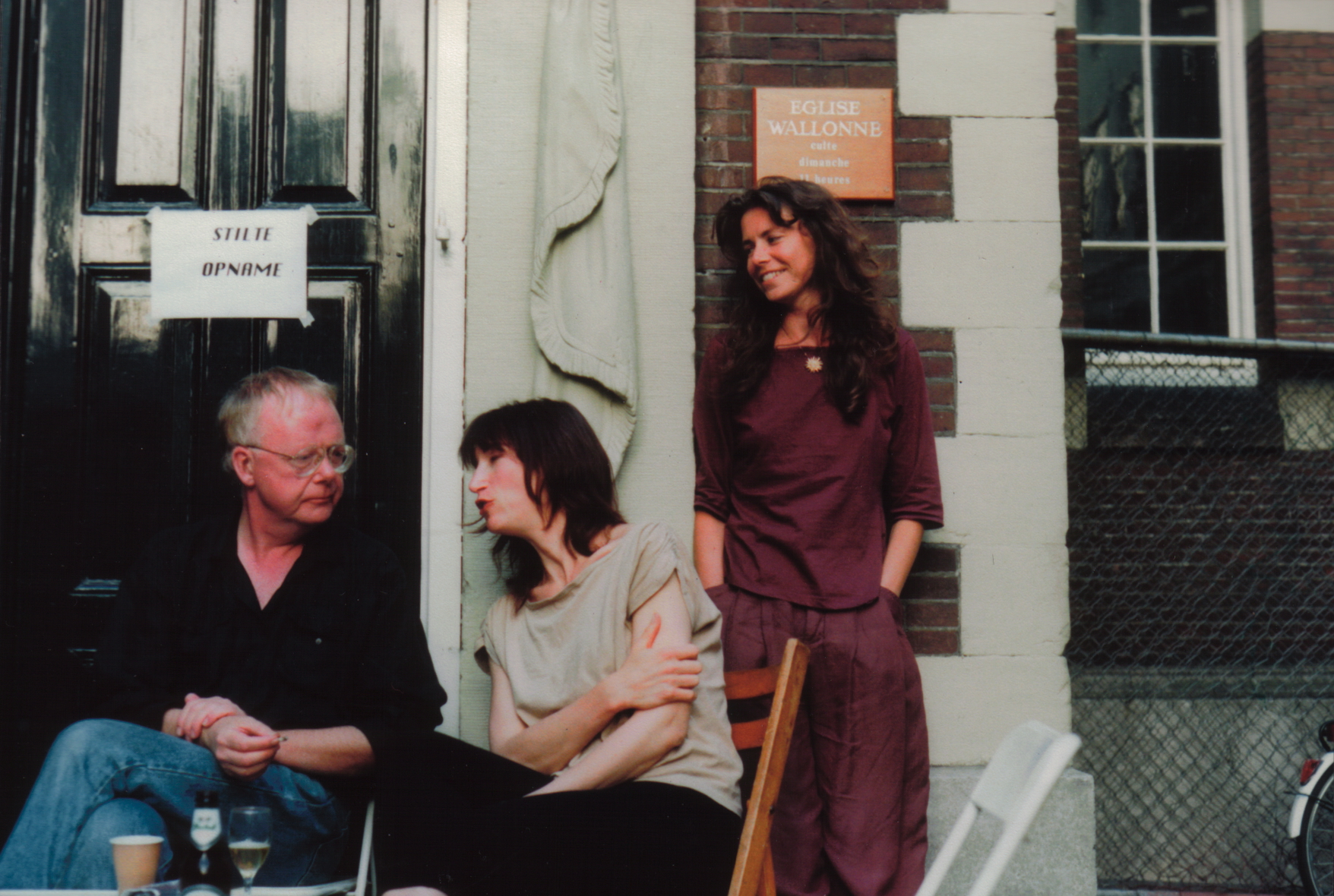 Louis Andriessen, Frances-Marie Uitti, and Annette den Heijer in front of the Waalse kerk during recordings of <i>The Memory of Roses</i> in 1993. Photo: Frits van der Waa