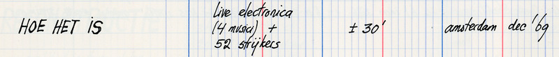 | Hoe het is : voor live electronica en 52 strijkers : Amsterdam 1969 / Louis Andriessen ; electronische schakelingen van Jan Herman Verpoorten | expression |
