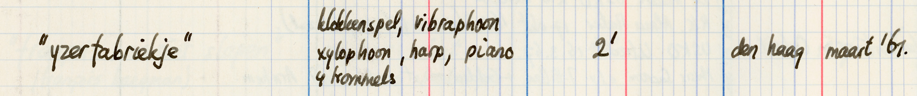 - IJzerfabriekje : voor klokkenspel, vibrafoon, xylofoon, harp, piano, 4 trommels