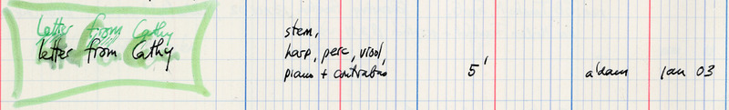 - Letter from Cathy : voor stem, harp, perc, viool, piano + contrabas
