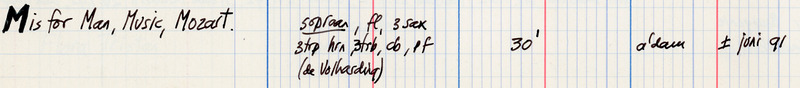 - M is for Man, Music, Mozart : voor sopraan, fluit, 3 sax, 3 trp, hrn, 3 trb, cb, pf (de Volharding)