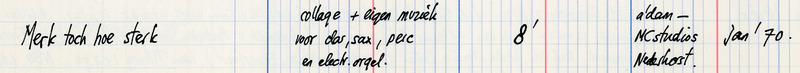 - Merk toch hoe sterk : voor collage + eigen muziek voor clar, sax, perc en electronisch orgel