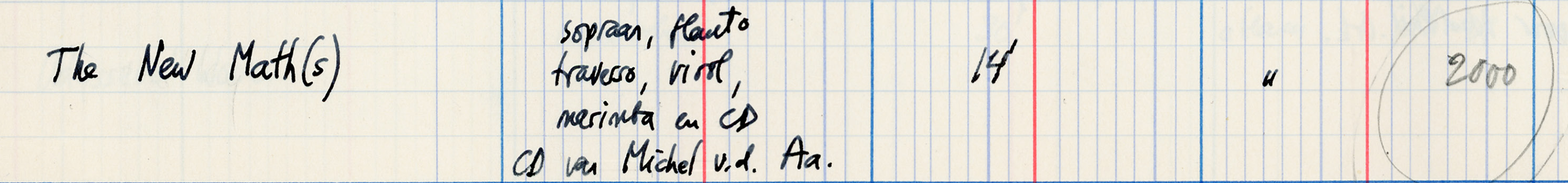- New Math(s), The : voor sopraan, flauto traverso, viool, marimba en cd, cd van Michel v.d. Aa