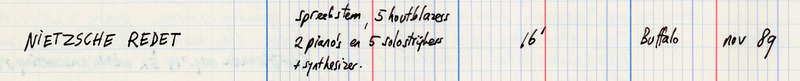 - Nietzsche redet : voor spreekstem, houtblazers, 2 piano's en strijkers : 1989 / Louis Andriessen ; tekst: Friedrich Nietzsche