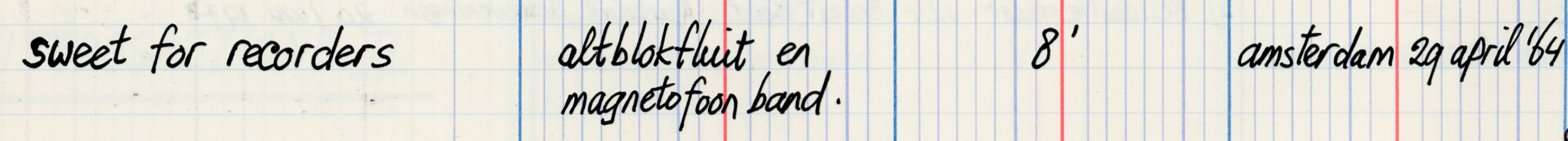 | Sweet for Recorders : for treble (alto) recorder and tape : Amsterdam, 29 april 1964 / by Louis Andriessen | expression |