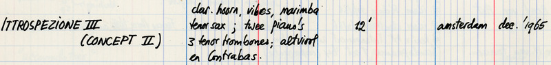 | Ittrospezione III : (concept I) : per due pianisti e tre gruppi strumentali : Amsterdam 4 febbraio 1964 / di Louis Andriessen | expression |