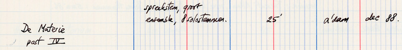 | De Materie : De materie (part IV) : female speaking voice, 8 voices and large ensemble : 1988 / Louis Andriessen | manifestation |